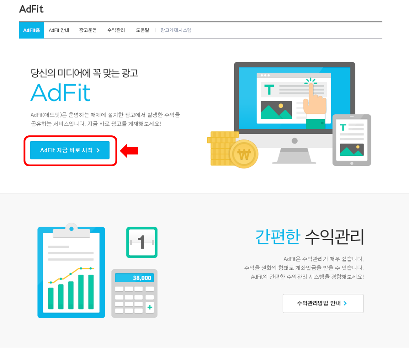 홈페이지에 들어가셔서 AdFit 지금 바로 시작 버튼을 눌러주세요.