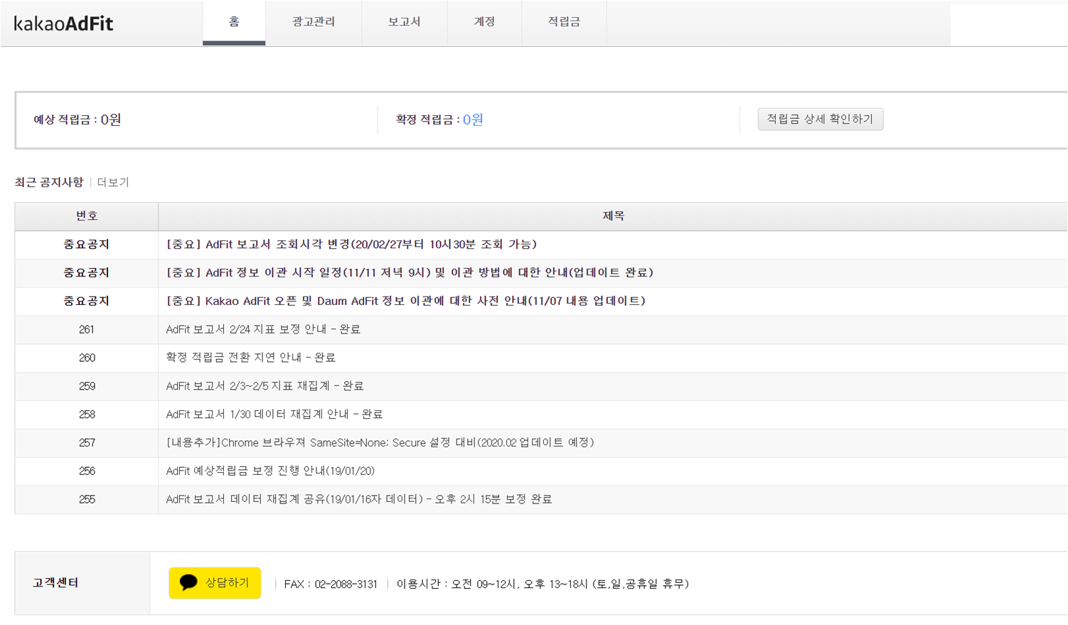 그러면 애드핏 홈 화면으로 들어가게 됩니다.
