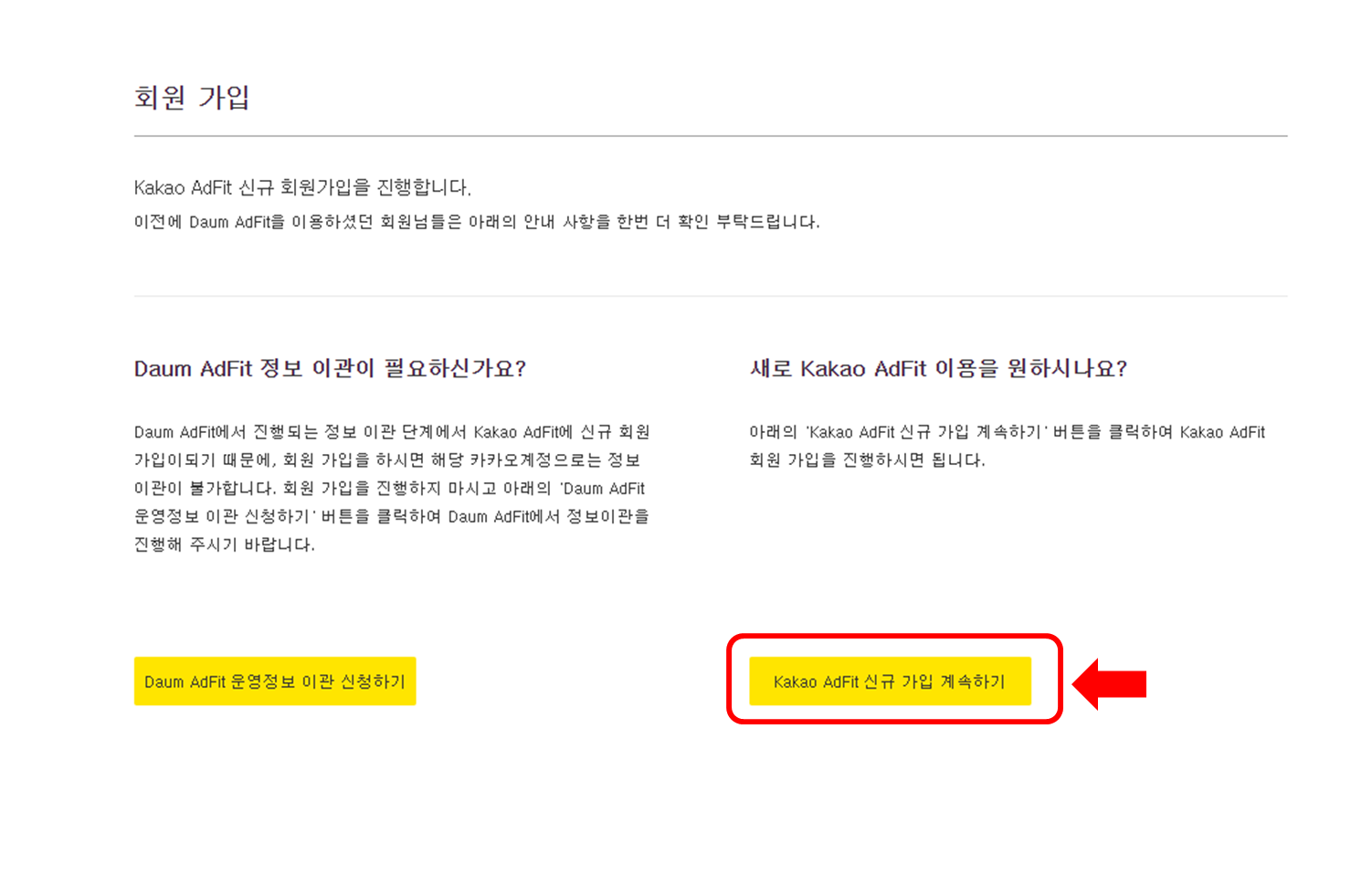 그러면 AdFit 회원가입을 시작하게 됩니다. Kakao AdFit전 Daum AdFit을 사용하신 분은 왼쪽 버튼을 클릭하고