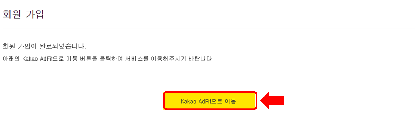 그러면 회원 가입이 완료되었다는 창이 뜹니다. 버튼을 눌러서 애드핏을 들어가 봐요.