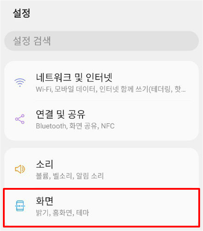 먼저 설정에서 화면을 찾아서 들어가 주세요.