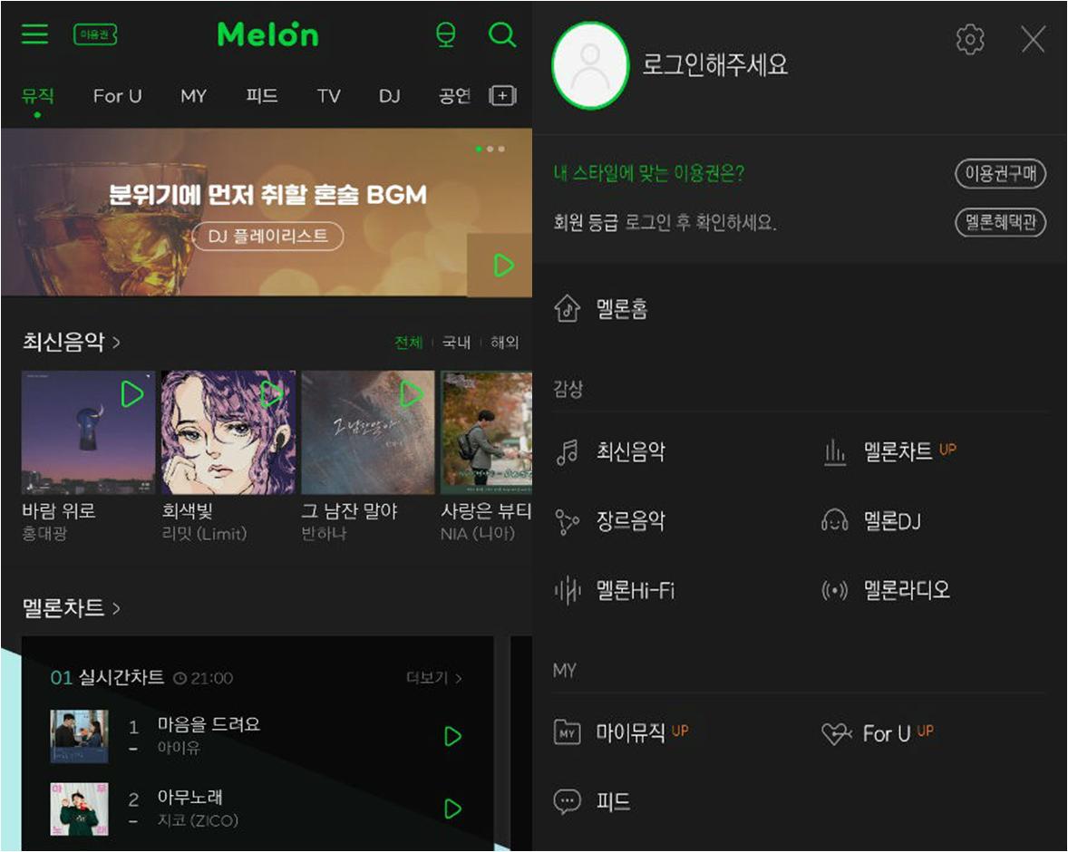 이상태로 멜론을 들어가시면 다크모드가 적용된 모습을 확인하실 수 있습니다.