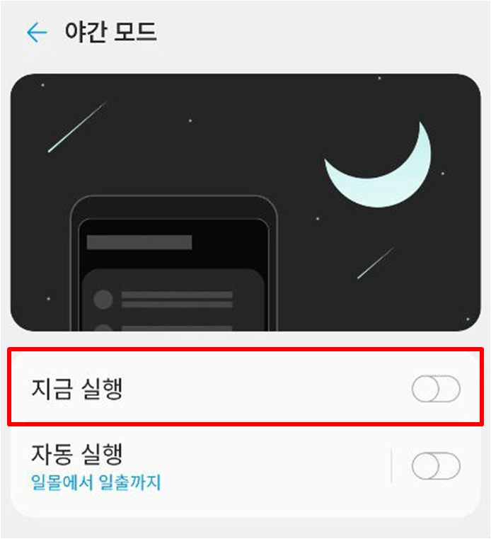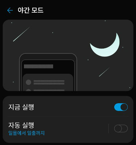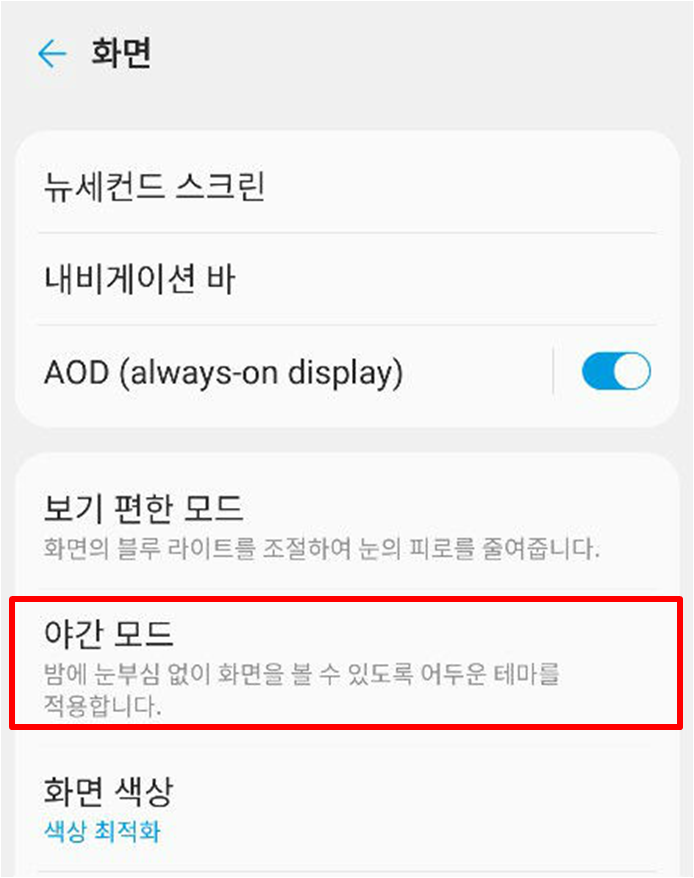 화면을 들어가시면 야간모드라는 탭이 있습니다. ( 안드로이드 10 버전부터 추가된 기능이에요 ^^ )